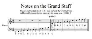 are each on a staff which is made up of five lines. These lines are called ledger lines. Each clef has 5 ledger lines and 4 spaces. The placement of notes will be on a line or a space. As seen in the above image, the first note on the bass clef “E” is a line note as it has a line running through it. The next note “D” is a space note, the next note “G” is a line note and so on. Since the “E” is below the five lines of the clef, there is a need to run a ledger line through it as it would be the next line note below the staff. When this occurs with a note above or below the staff a small ledger line is used and it is limited to just that note. The new ledger line is not extended the full length of the staff.